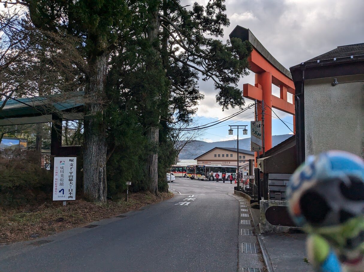 山道を抜けると、有名な箱根神社の鳥居が見えてきました。奥には芦ノ湖もあります。